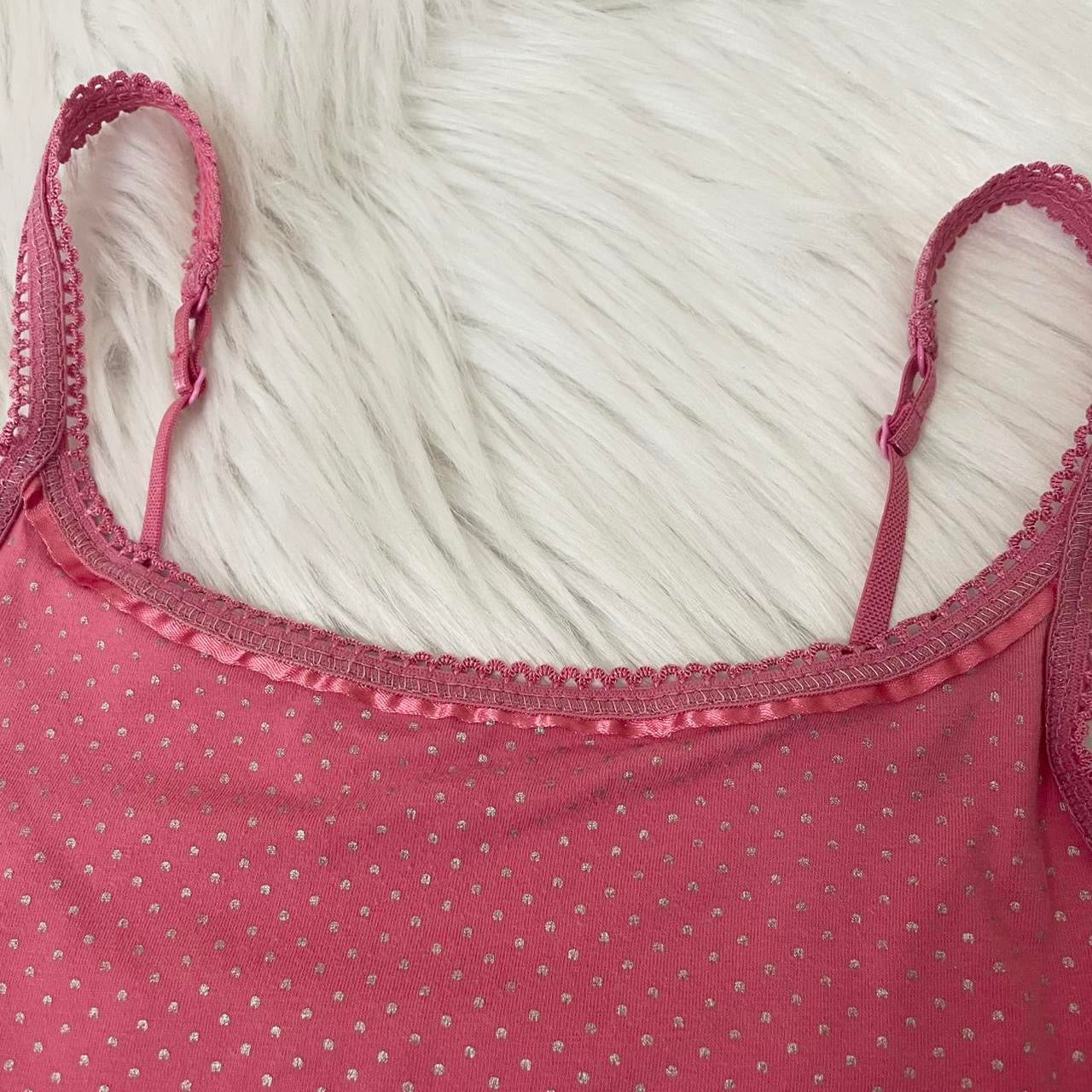 Adorable early 2000s fitted cami, perfect for layering or a sparkly going out moment 💅 Comes in baby pink cotton with shimmery polka dots, frilly trim neckline, and adjustable straps for the perfect fit. Includes a built-in shelf bra for comfort and support — total mall girl essential.